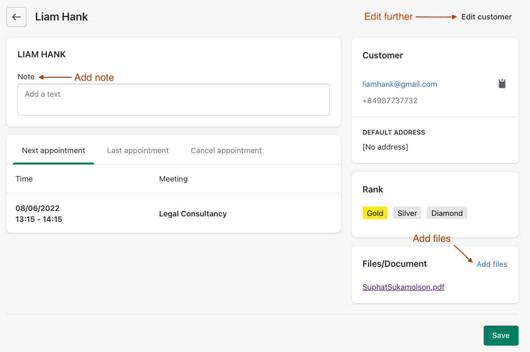 Inside a customer's page, you can quickly edit some information by adding a note or files. Then click on Save to save information.