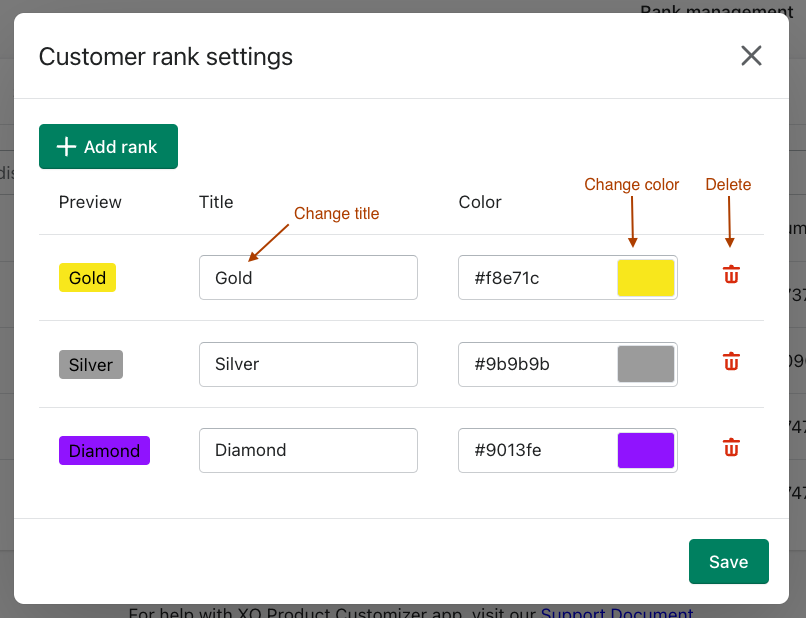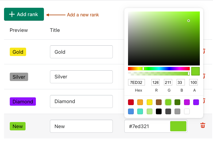 - Here, you can change the title and the color of each rank. Or click on the red trash icon to remove a rank.