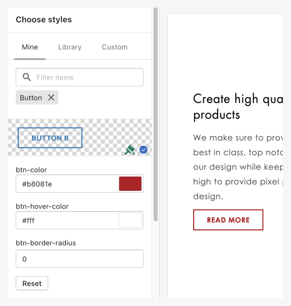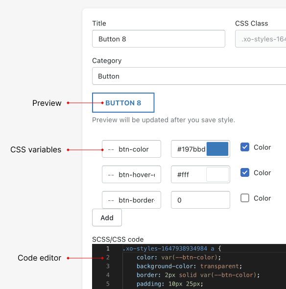 When create a new style, XO Sections will create new CSS class for you. Then you need to add CSS properties to customize it.